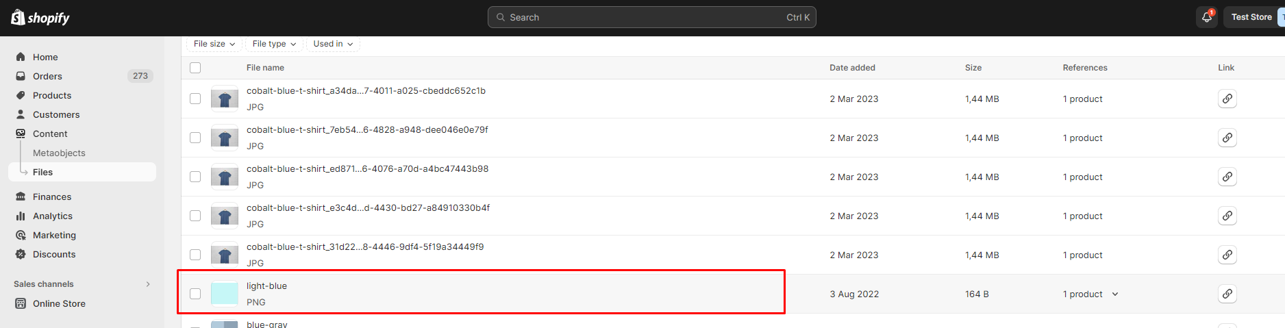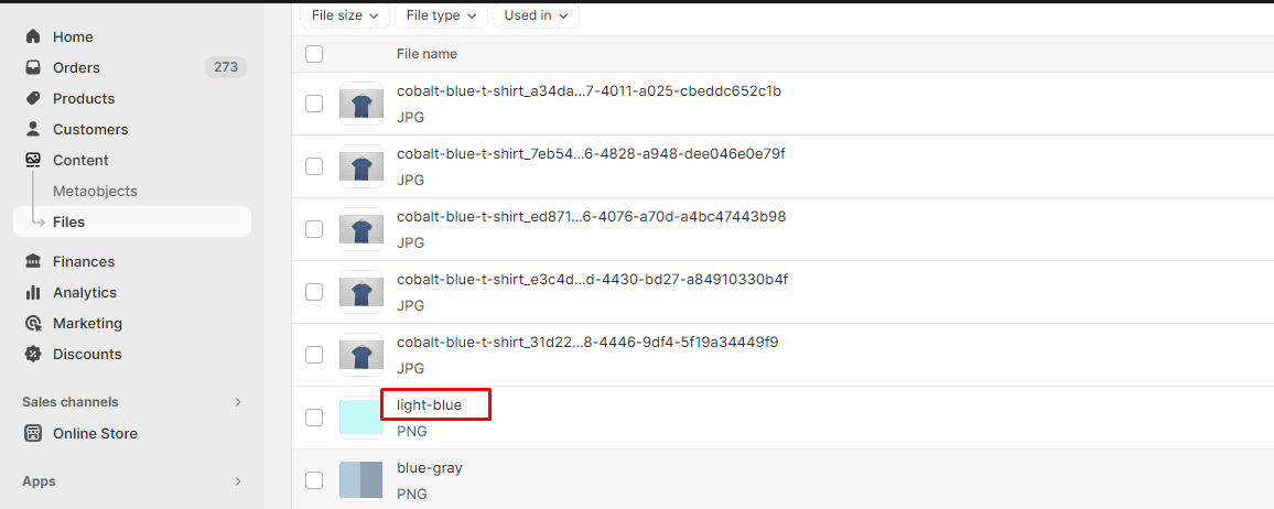 1. Upload swatch image in the Content>Files, as shown below: