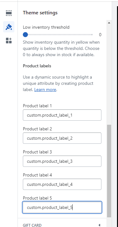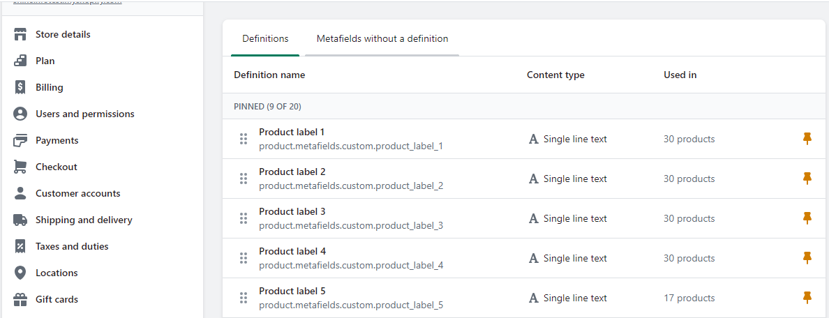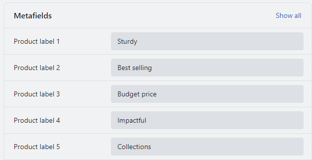 Enter product labels like custom.product\_label setup from the store settings and then product page meta fields. For more information related to meta fields, check the below details.\