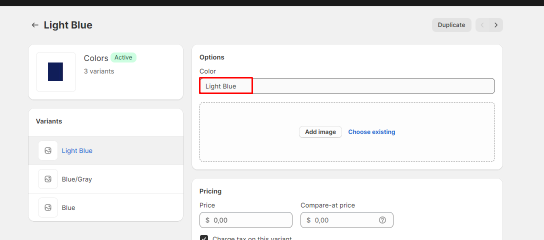 2. Type the variant name(case sensitive) and the image name(case sensitive) in the Custom color codes, as shown below:\