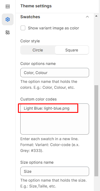 <table data-header-hidden><thead><tr><th width="284"></th><th></th><th data-hidden></th></tr></thead><tbody><tr><td>Show variant image as color</td><td>Select checkbox to show variant image as color.</td><td></td></tr><tr><td>Color style</td><td>Select from circle, tiles or square to show the swatches style.<br><em>(Note: Tiles is not applicable with the variant image.)</em></td><td></td></tr><tr><td>Color options name</td><td>Enter the option name that holds the colors. E.g., Color, Colour, etc.</td><td></td></tr><tr><td>Custom color codes</td><td>Add color codes for the options as per the following details: The left-side options will be the names of the categories that hold the colors (e.g., Color, Material), while the right-side values will be the corresponding color codes, separated by an equals sign. <br><br>For example, if the variant name is "<strong>plaid</strong>" under the "<strong>Color</strong>" category, the color code should be entered as "plaid:#ccc." <br>(<em>Please note that the color option names are case-sensitive</em>.)</td><td></td></tr><tr><td>Size options name</td><td>Enter the option name that holds the size. E.g.: Size,Taille, etc.</td><td></td></tr></tbody></table>