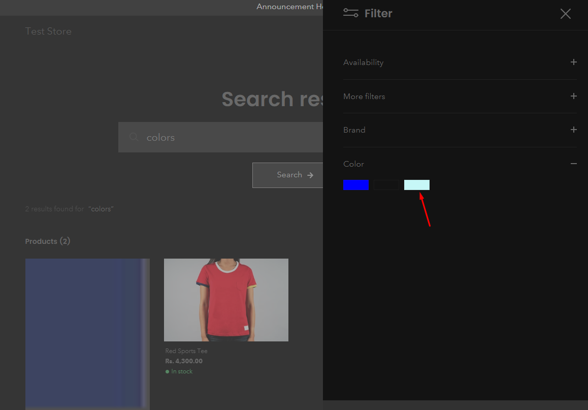 <table data-header-hidden><thead><tr><th width="284"></th><th></th><th data-hidden></th></tr></thead><tbody><tr><td>Color scheme</td><td><p>Select the color scheme options from the options; </p><p>-Primary </p><p>-Secondary </p><p>-Tertiary </p><p>-Quaternary </p><p> </p><p>These can be managed from <strong>Theme settings> color schemes.</strong></p></td><td></td></tr><tr><td>Suggestions</td><td><p><strong>Heading</strong><br>Add text to the heading in the search drawer. E.g., Suggestions.<br><br><strong>Product</strong><br>Select products to show them under suggestions in the search drawer. <br><br><strong>Image ratio</strong><br>Select the image ratio from the given options: </p><p>-Auto </p><p>-Landscape </p><p>-Portrait </p><p>-Square<br><br><strong>Grid image fit</strong><br>Select the image fit from the following options:<br>- Cover<br>- Contain</p></td><td></td></tr><tr><td>Search results</td><td><p><strong>Product image ratio</strong> </p><p>Select product image ratio from the given options:</p><p>-Auto </p><p>-Landscape </p><p>-Portrait </p><p>-Square </p><p> <br><strong>Grid image fit</strong><br>Select the image fit from the following options:<br>- Cover<br>- Contain<br></p><p><strong>Article image ratio</strong> </p><p>Select the article image ratio from the given options: </p><p>-Auto </p><p>-Landscape </p><p>-Portrait </p><p>-Square</p></td><td></td></tr></tbody></table>